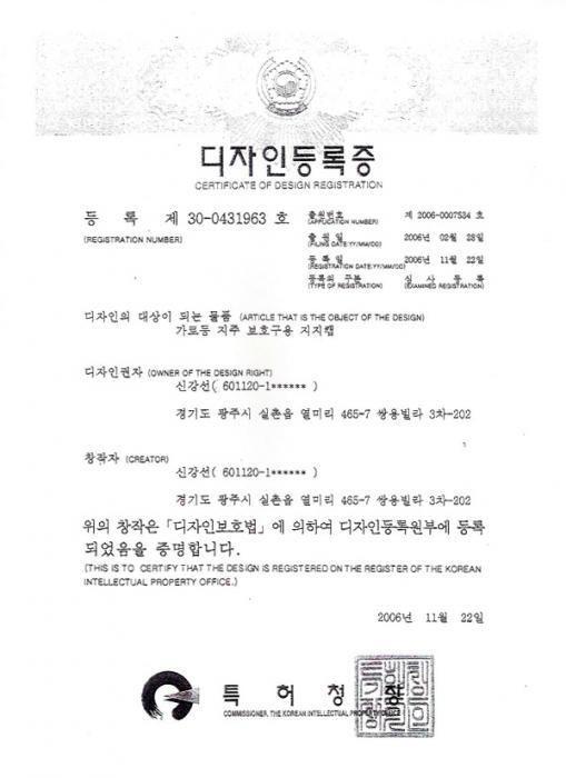 가로등지주 보호구용 지지캡 제30-0431963호 > 특허증