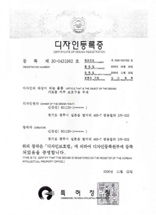 가로등 지주보호구용 부재 제30-0431962호 > 특허증