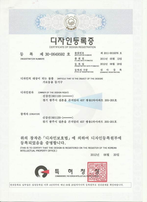 가로등용등기구-제30-0649592호 > 특허증